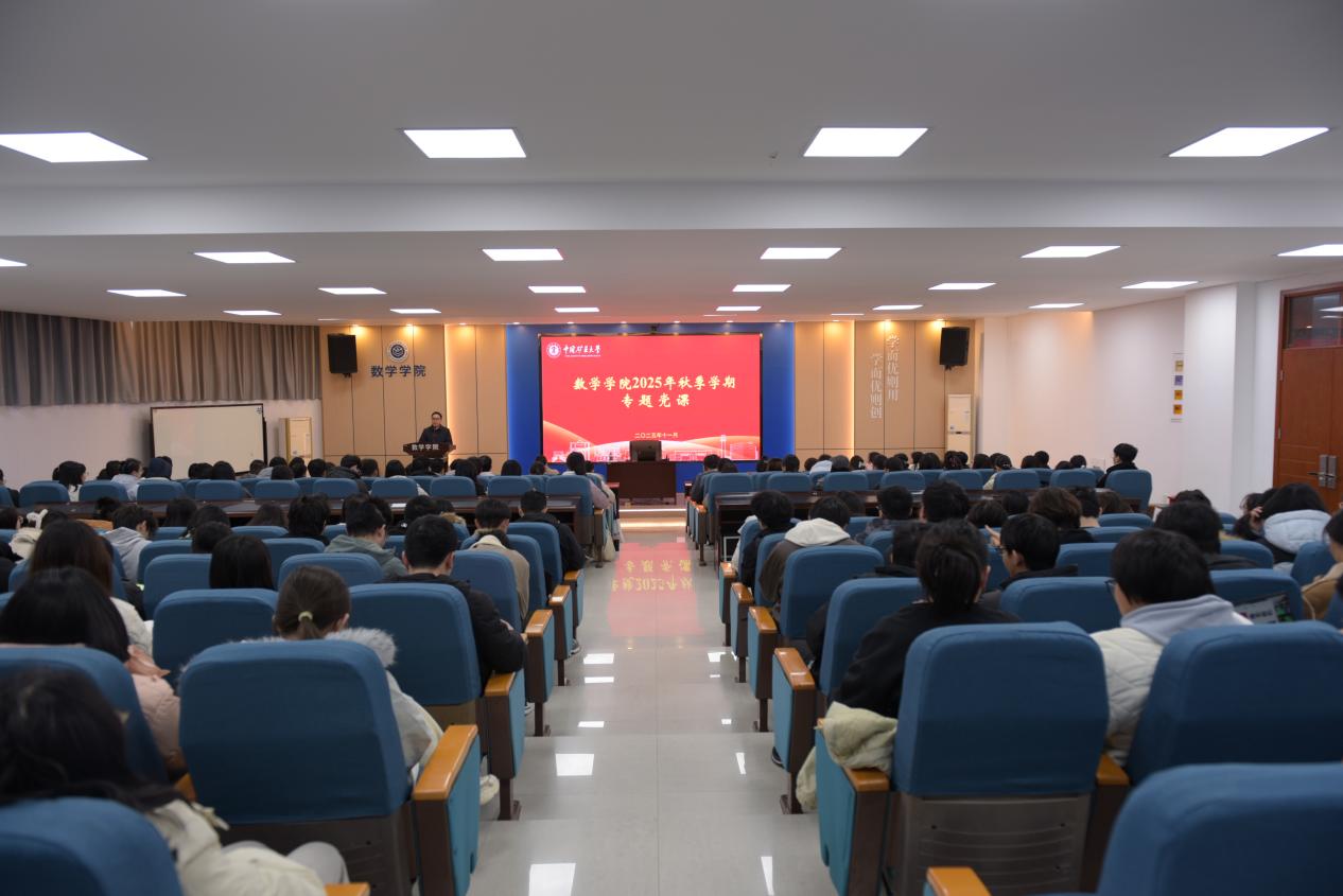 11月19日下午,学校关心下一代工作委员会副主任张万海应邀为数学学院学生讲授专题党课。数学学院全体专兼职辅导员、学院2025年青马班学员、第68期入党积极分子、发展对象和全体在校学生党员等共计180余人参与学习,专题党课在数学大讲堂举行,由数学学院党委副书记王虎主持。