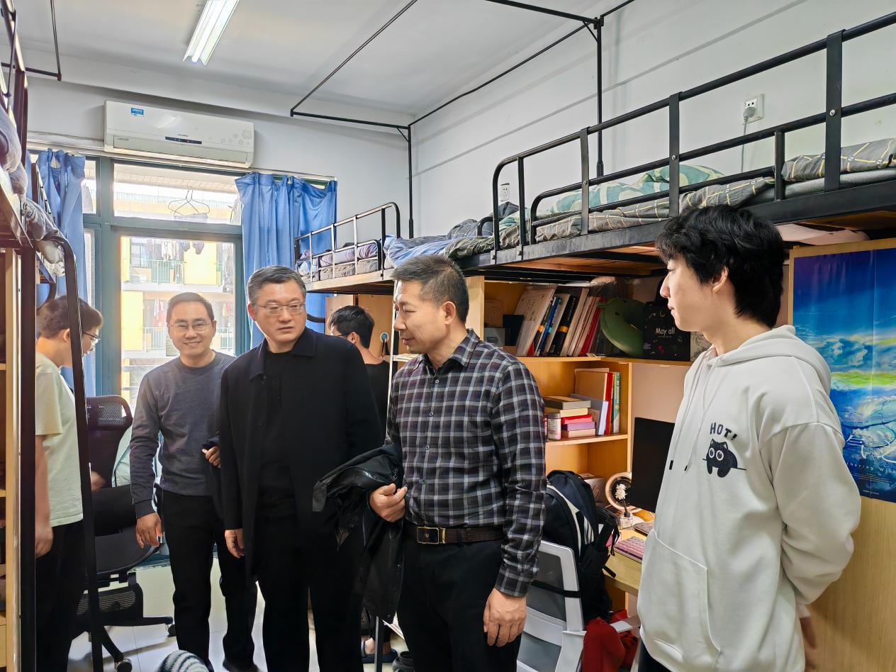 随后,院领导一行深入研究生与本科生宿舍,了解学生们的学业进展、日常生活、实习以及就业等情况。嘱咐同学们要劳逸结合、保重身体,养成自律自强的良好习惯,增强安全防范意识,合理规划学业与生活。同时,本次宿舍走访重点排查了违规电器、私拉乱接等安全隐患,跟同学们反复强调要勤打扫、常通风,杜绝违规用电行为,自觉遵守宿舍管理规定,共同营造安全、文明、整洁的住宿环境。