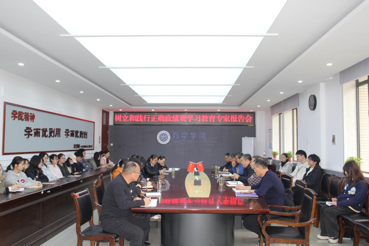 为深入学习贯彻习近平总书记关于树立和践行正确政绩观的重要论述,推进学院树立和践行正确政绩观学习教育走深走实,3月26日下午,数学学院举办树立和践行正确政绩观学习教育专家报告会,邀请我校马克思主义学院院长、党委副书记阎国华教授作专题辅导报告。学院党委理论学习中心组成员、党支部书记、学生党员代表等40余人参加了此次报告会。报告会由学院党委书记戎辉主持。
