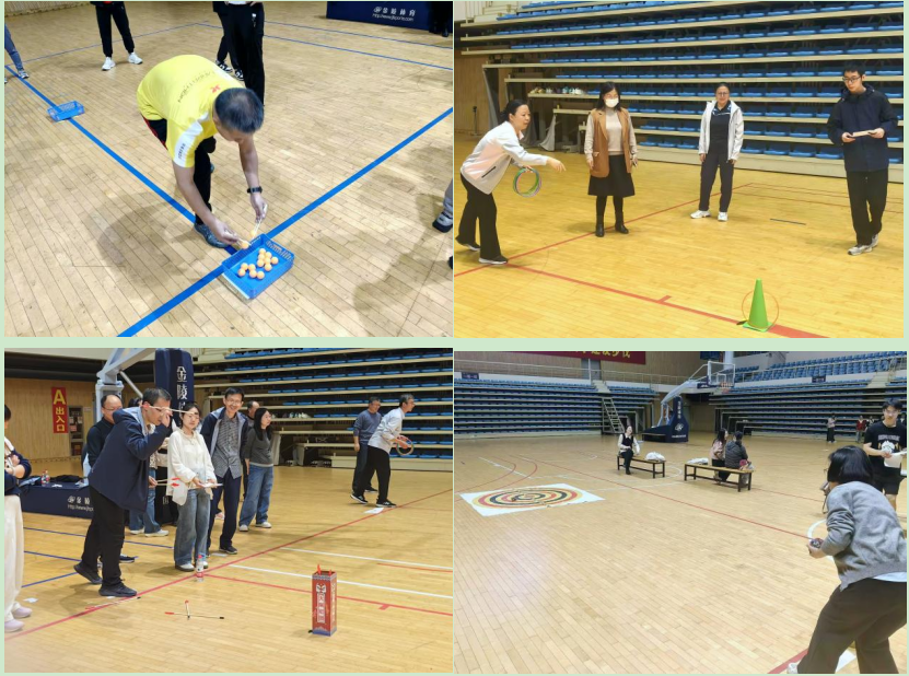 个人项目同样精彩纷呈,包括夹乒乓球、投壶、踢毽子、跳绳、套圈和滚沙包6项。这些项目兼具趣味性、协作性与安全性,参与度高、体验感好。老师们根据自身兴趣和特长自由选择,有的在夹乒乓球比赛中稳中求快、手眼协调;有的在投壶前屏息凝神、精准一掷;踢毽子、跳绳最耗体力,老师们一次次尝试,不断创下数据新高;套圈和滚沙包区域更是排起长队,大家在轻松愉悦的氛围中重温童年游戏的乐趣。