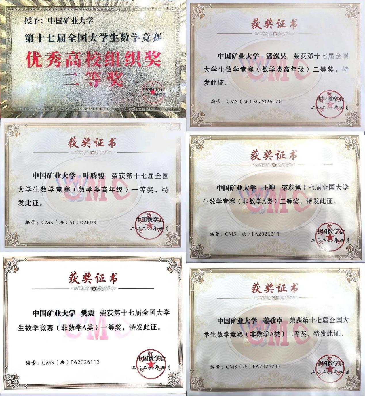 第十七届全国大学生数学竞赛获奖证书